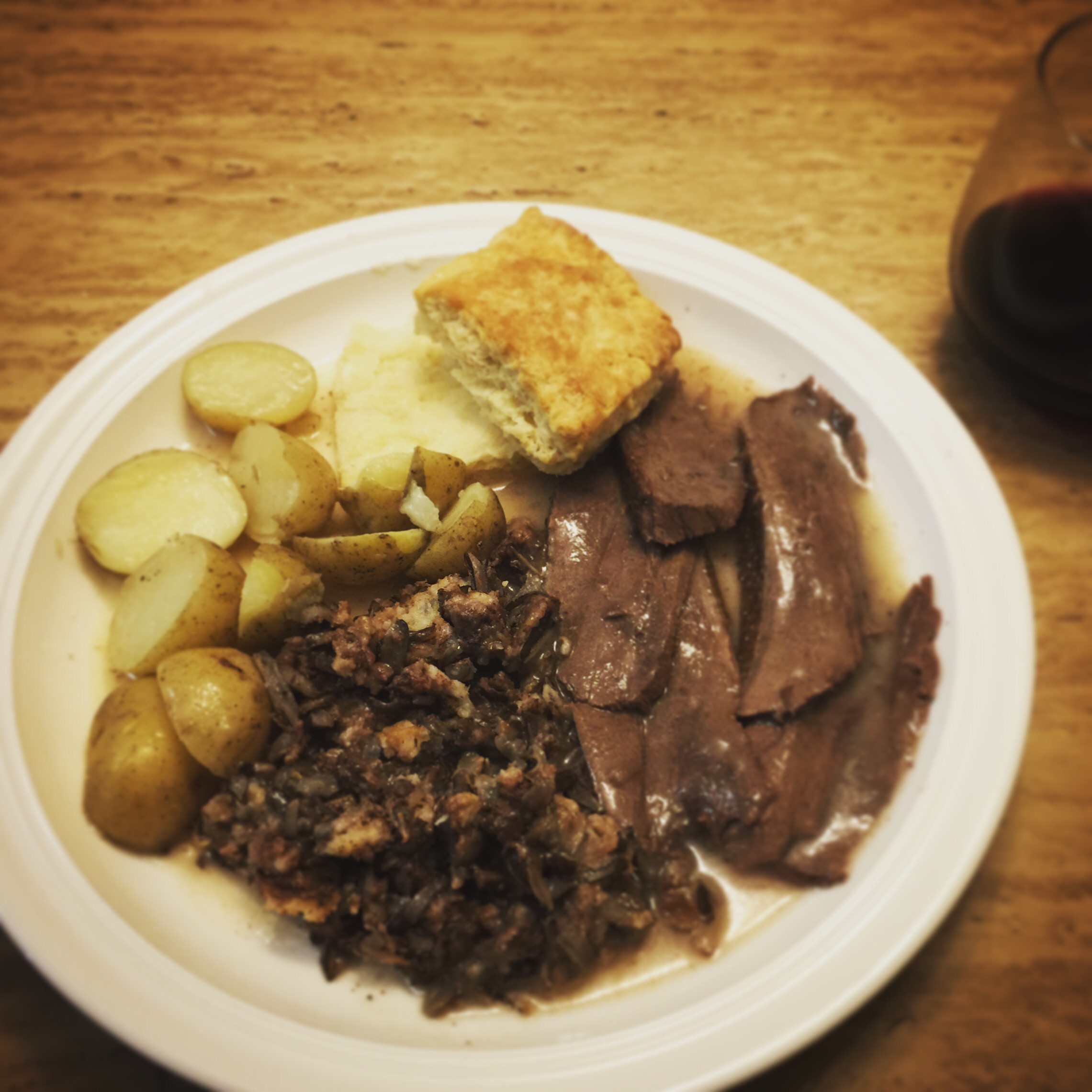 Roast Goose w. Wild rice stuffing, thick gravy, potats and biscuits.